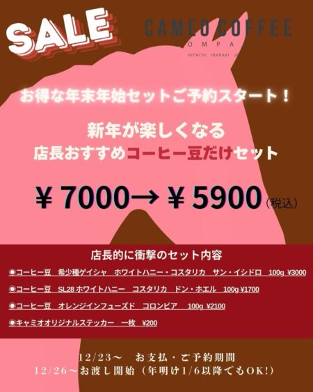 年末お得なコーヒーセットキャンペーン! コーヒー豆も、コーヒー器具も数量限定となります。 コーヒー豆は年始に販売しますが、こんなに安く出せないので、セットでぜひゲットしてください。 […] 2025-12-222025-12-23 投稿者: CAMEO COFFEE COMPANY 続きを読む