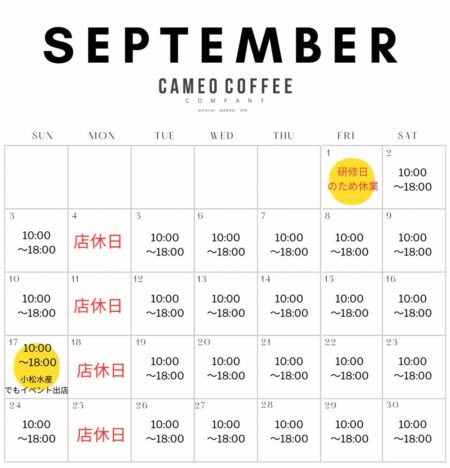 おはようございます!9月の営業カレンダーです!本日9月1日は、月初の研修日で休業となります。お間違いのないようお願い申し上げます。#japancafe #coffeeshopinjapan #hitachicoffee #ibarakicoffee #coffeejapan #ひたち海浜公園 #日立市 #コーヒー豆専門店 #コーヒー豆屋 #茨城コーヒー #localheroandgap #大みか神社 #泉神社 #茨城キリスト教大学 #日立市海水浴 #大みか #高萩市イベント #高萩ほおずき #coffeelover #omikafestival #コーヒー好きと繋がりたい […] 2023-08-312023-09-01 投稿者: CAMEO COFFEE COMPANY 続きを読む